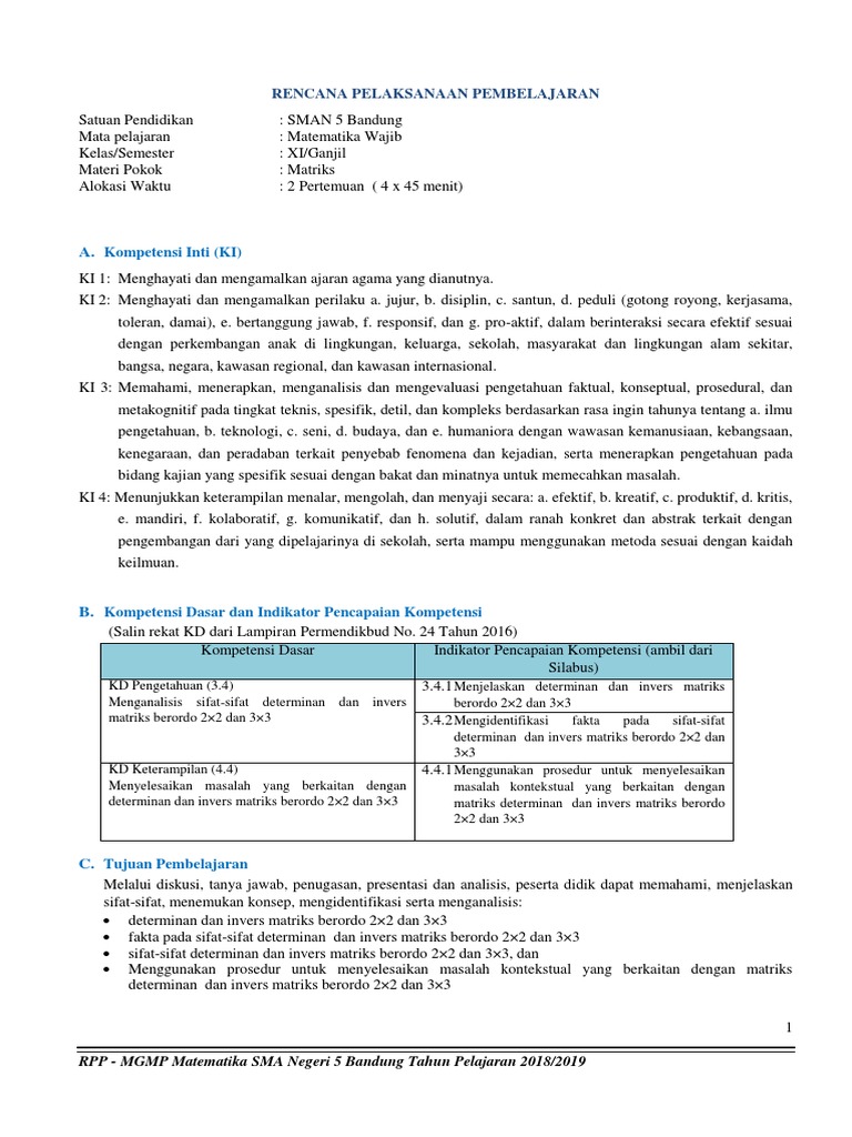 Rpp Matriks Kelas Xi Mipa Kurikulum 2013 from reader020.staticloud.net Matriks (rpp & lkpd) 1. Kompetensi inti sma kelas xi. Pada postingan sebelumnya saya telah memposting mengenai perangkat pembelajaran untuk mata pelajaran matematika wajib dan matematika peminatan untuk jenjang sma kelas 10 dan kelas 12 kurikulum 2013 revisi 2020. Dengan bantuan presentasi komputer, guru menayangkan apa yang telah dipelajari dan disimpulkan mengenai determinan, invers , dan transpose pada matriks ordo 2 x 2 dn ordo 3 x 3/ refleksi terhadap kegiatan yang sudah dilaksanakan. Rpp matematika smk kelas xi operasi matriks. Xi/ ganjil alokasi waktu : Rppguru.com adalah blog yang berbagi informasi get kunci jawaban tema 1 kelas 5 sd gif, kunci jawaban, aplikasi dan administrasi guru yang mana file berikut ini adalah kumpulan dari berbagi sumber tentang matriks kelas 11 rpp yang bisa bapak/ibu gunakan dan diunduh secara gratis dengan menekan tombol download dibawah ini. Xi.mia 3 / 1 ( satu ) mata pelajara n :